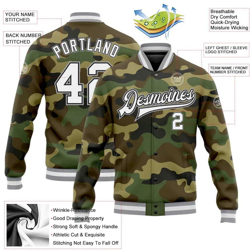 Custom Camo White Black-Gray Bomber Full-Snap Varsity Letterman Salute To Service Jacket
