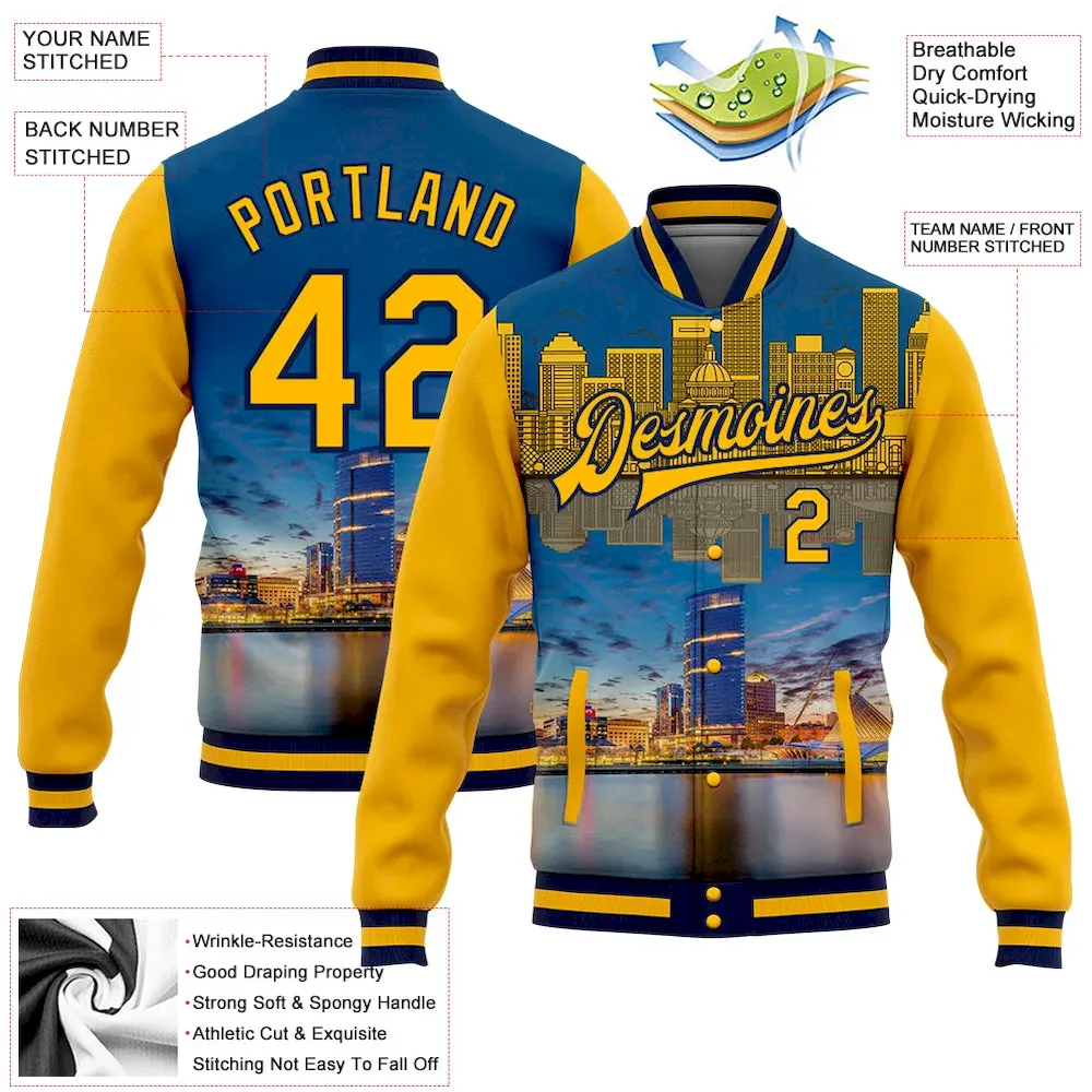 Custom Gold Navy Milwaukee Wisconsin City Edition 3D Bomber Full-Snap Varsity Letterman Jacket